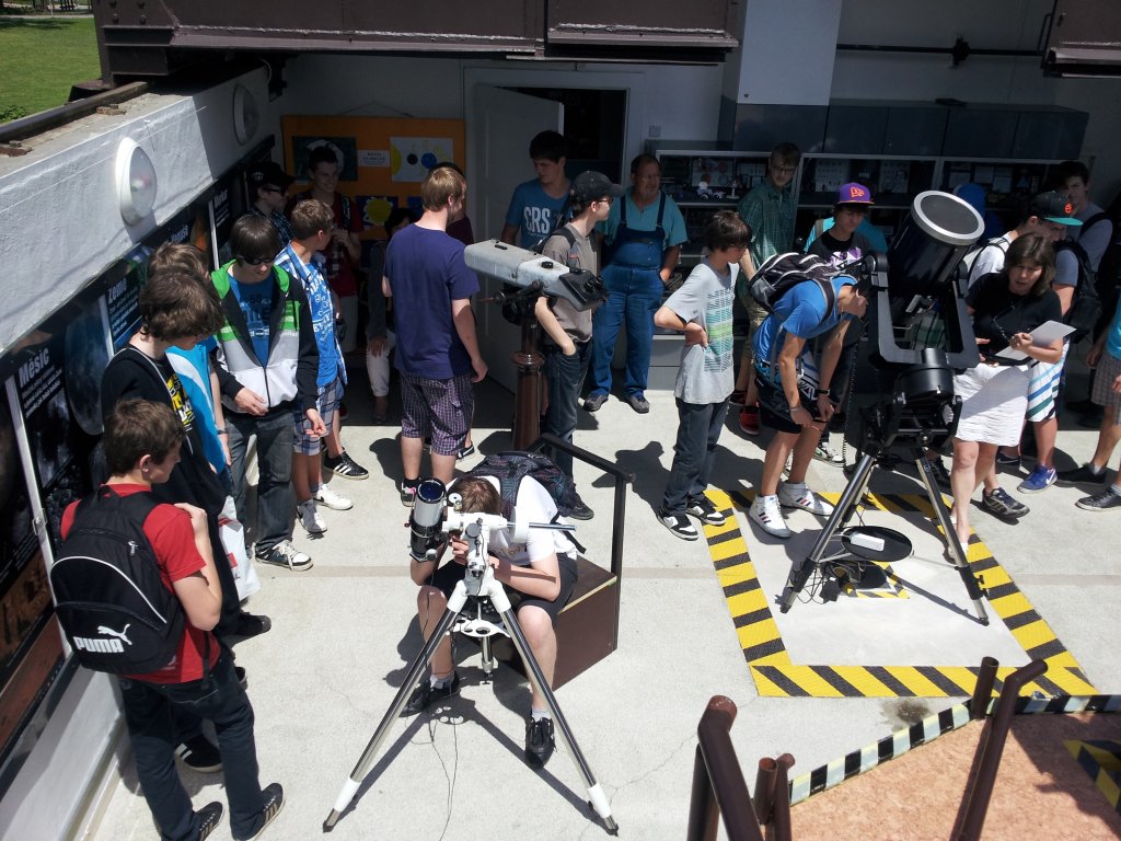 Poté pokračovali na hvězdárnu, kde se zúčastnili přednášky pana ředitele Prudkého Minimum astronomických znalostí středoškoláka. Jelikož přálo počasí, mohli jsme společně také pozorovat několika speciálními dalekohledy Slunce, prohlédnout si tak sluneční skvrny a protuberance. Přes nabitý program jsme si na prostějovském náměstí našli čas i na zmrzlinu.